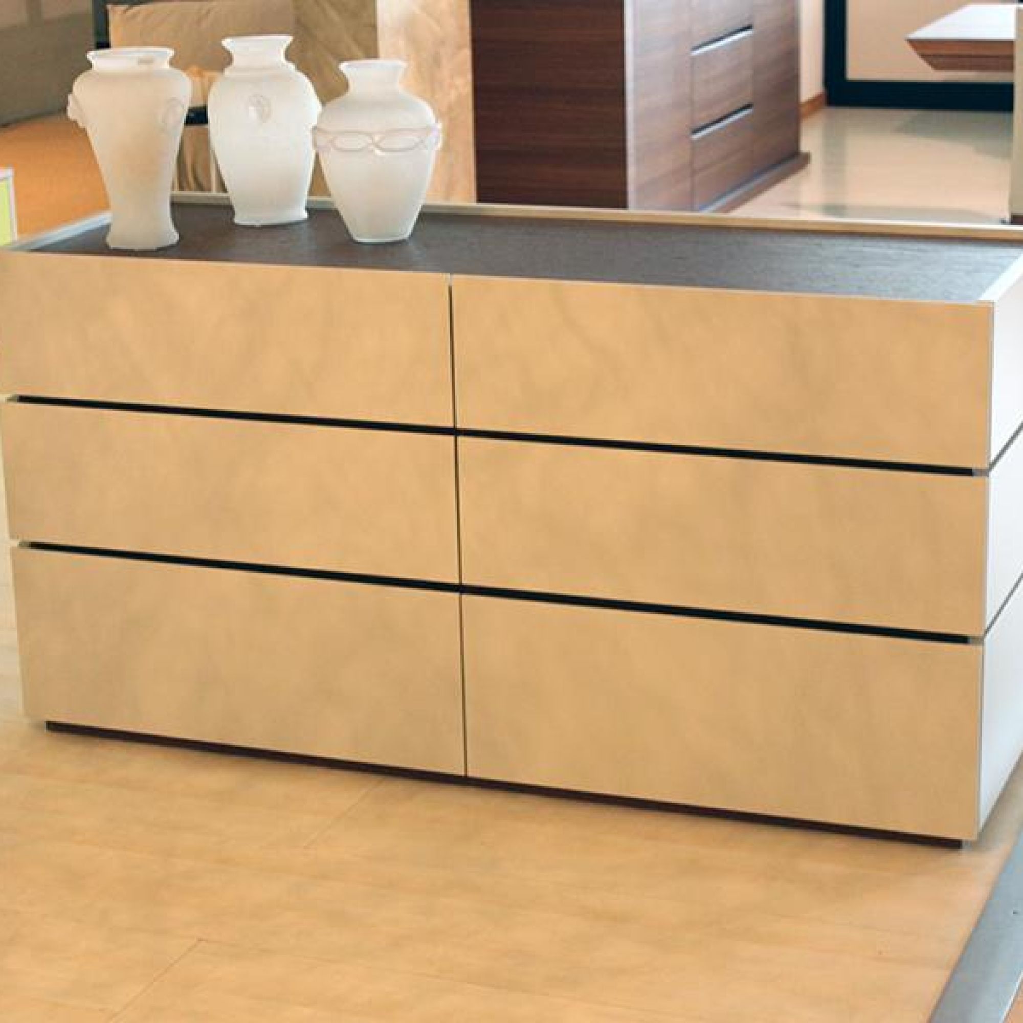 Cassettiera 6 cassetti Morassutti modello "Maverik" laccato opaco Korda inserto in legno rovere tabacco.