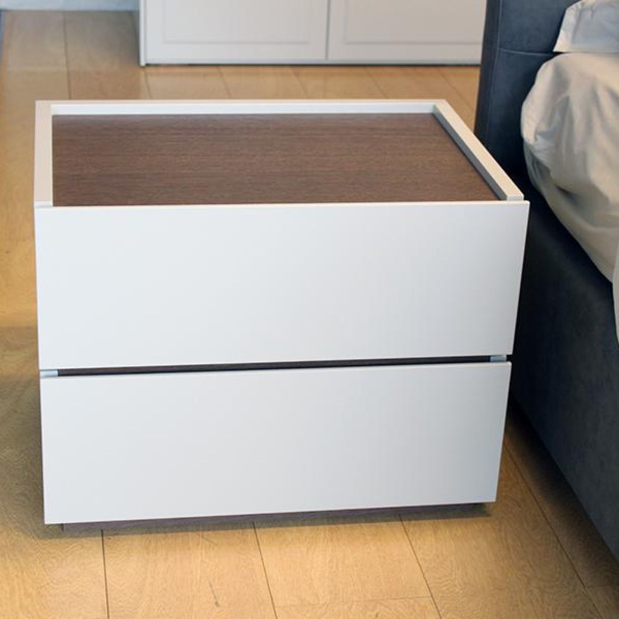 Comodino Morassutti 2 cassetti "Maverik", laccato lako Korda inserto in legno rovere tabacco.L. cm.60 , H. cm.46 , P. cm.43