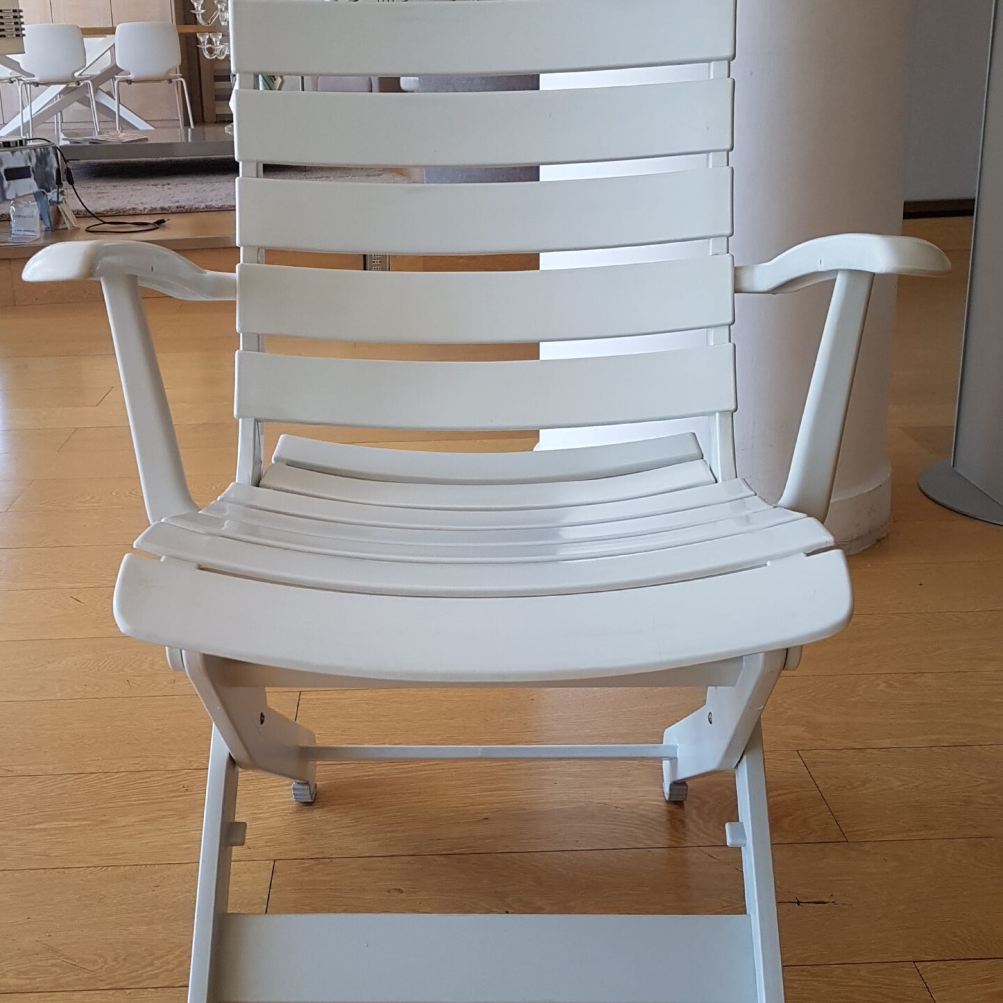Poltrona in resina bianca, inclinabile 5 posizioni, chiudibile, BREVETTATA, ferramenta in acciaio inox.